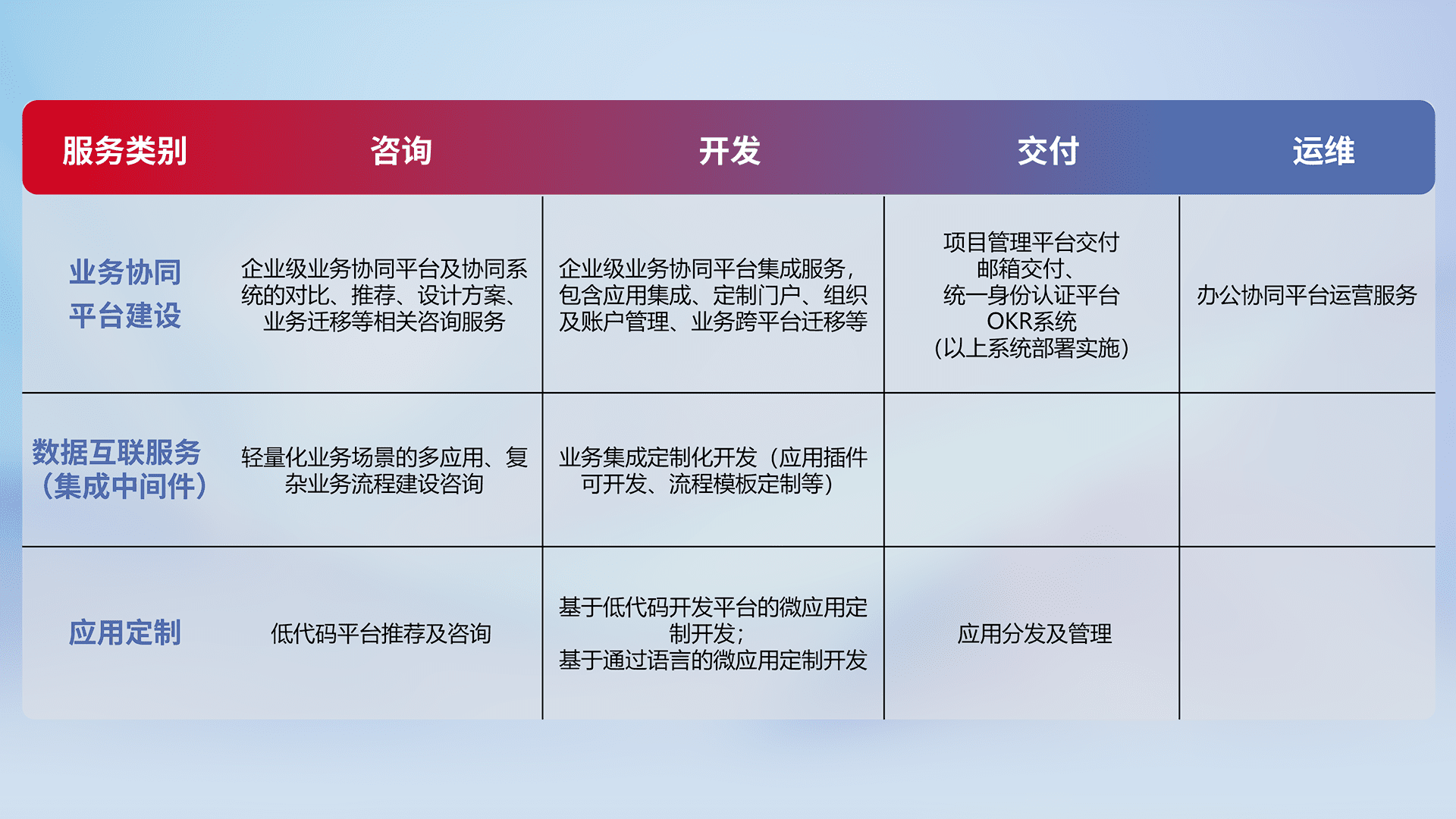 针对钉钉、、企微、、IDaas等平台级产品提供产品的规划、、、、方案、、、、交付、、、、定制化开发等服务,,实现如统一协同办公、、、智能客户服务、、混合会议管理、、智能数据查询、、、等业务场景,,,,实现数字化转型。。